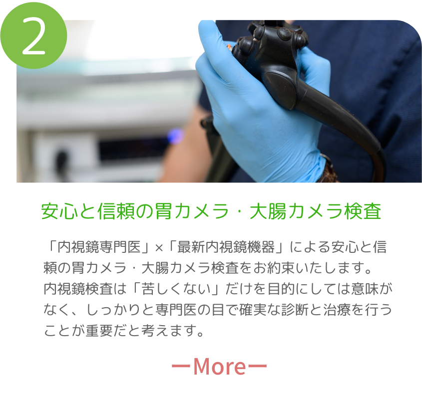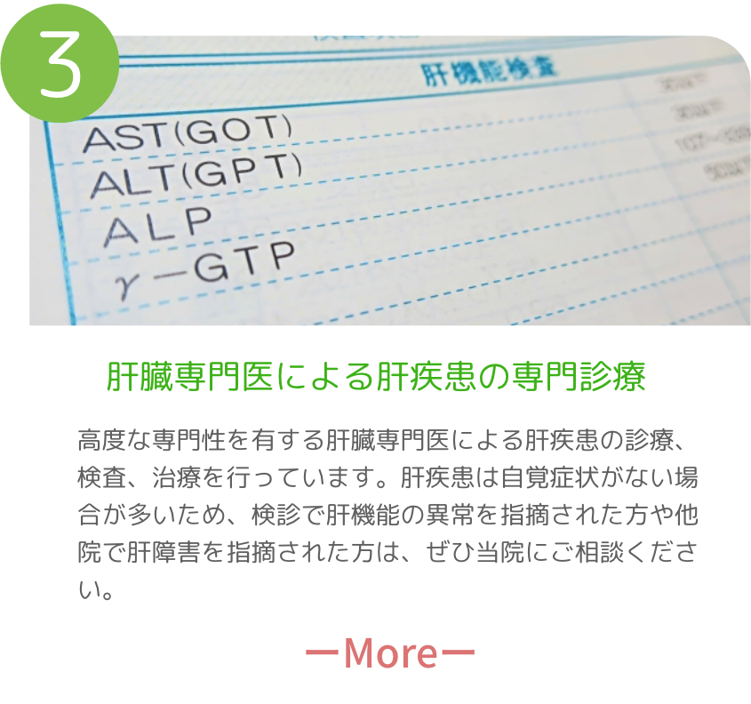 消化器内科(内視鏡検査)、肝臓内科に強みを持ちながら、風邪や発熱、生活習慣病などの一般内科、咳や喘息などの呼吸器内科、高血圧や不整脈などの循環器内科領域も含め、みなさまのお身体をトータルで診療いたします。どんなことでもお気軽にご相談ください。