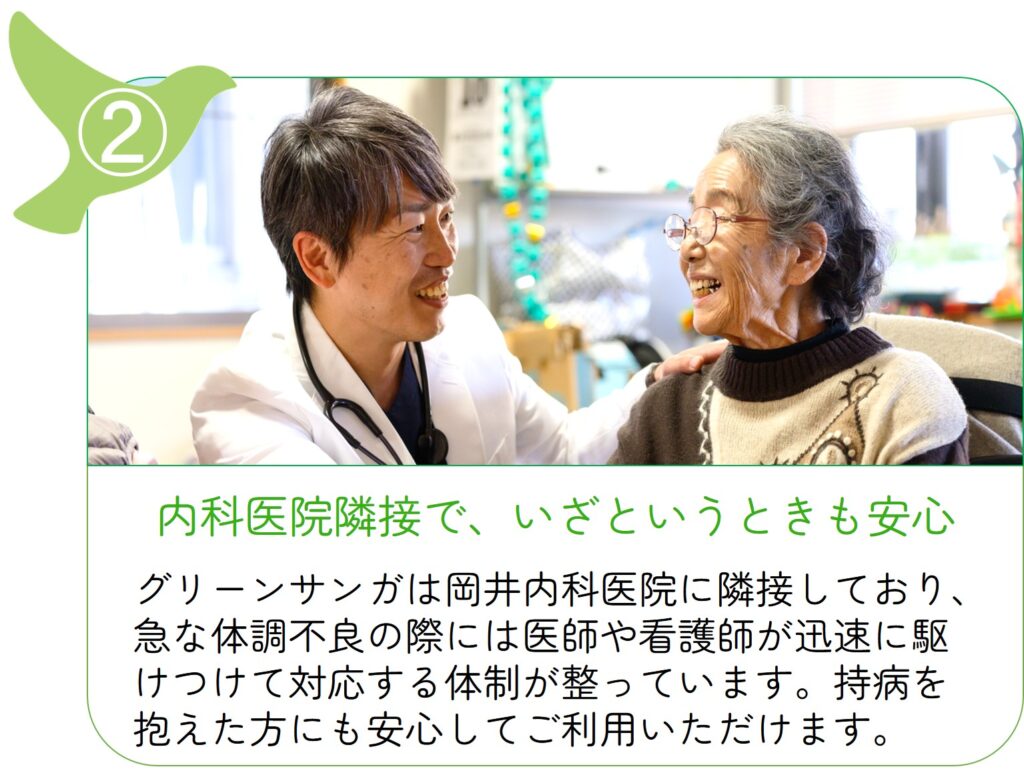 2003年に岡井内科医院に隣接してデイサービス・介護支援事業所の「グリーンサンガ」が開設されました。